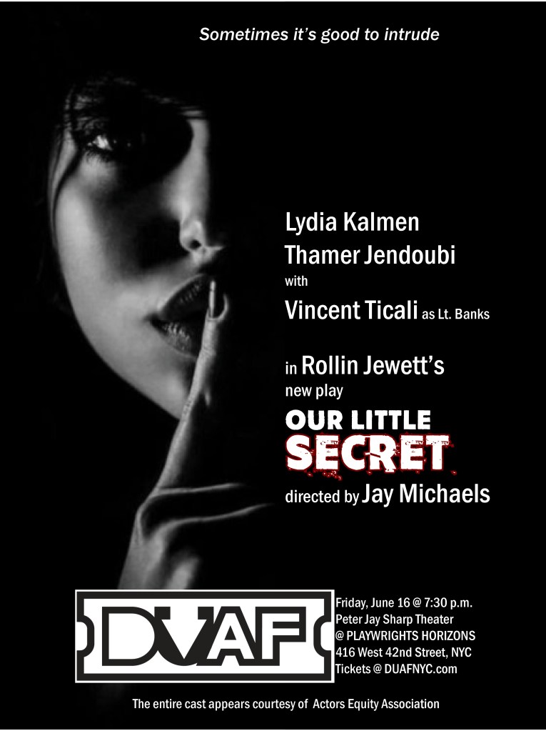 Play and screenwriter Rollin Jewett returns to the Downtown Urban Arts Festival with a dark comedy involving breaking and entering. Lydia Kalmen & Thamer Jendoubi in OUR LITTLE SECRET with Vincent Ticali as Lt. Banks in a production directed by Jay Michaels. Premiering Friday, June 16 @ 7:30 p.m. at the Peter Jay Sharp Theater @ Playwrights Horizons, 416 West 42nd Street, NYC, Tickets @ DUAFNYC.com.